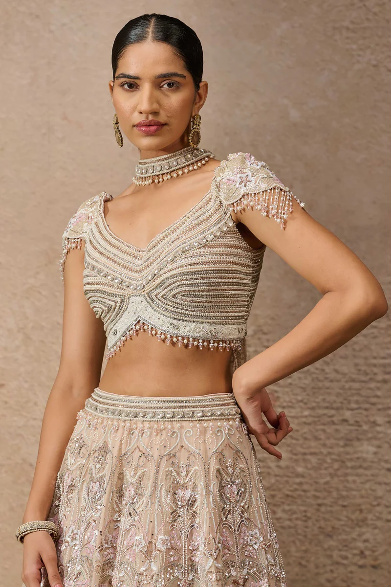 The lehenga is a grand, floor-length silhouette fashioned from high-quality net and silk-blend fabrics in a soft blush-pink and ivory palette. It features exhaustive architectural embroidery that blends floral vine motifs with structured grid-work. The surface is illuminated with a shimmering spray of sequins and hand-applied crystals, leading down to a magnificent scalloped border. Each panel is designed to create a voluminous flare that moves with grace, while the internal construction provides the necessary weight for a regal, red-carpet presence.
