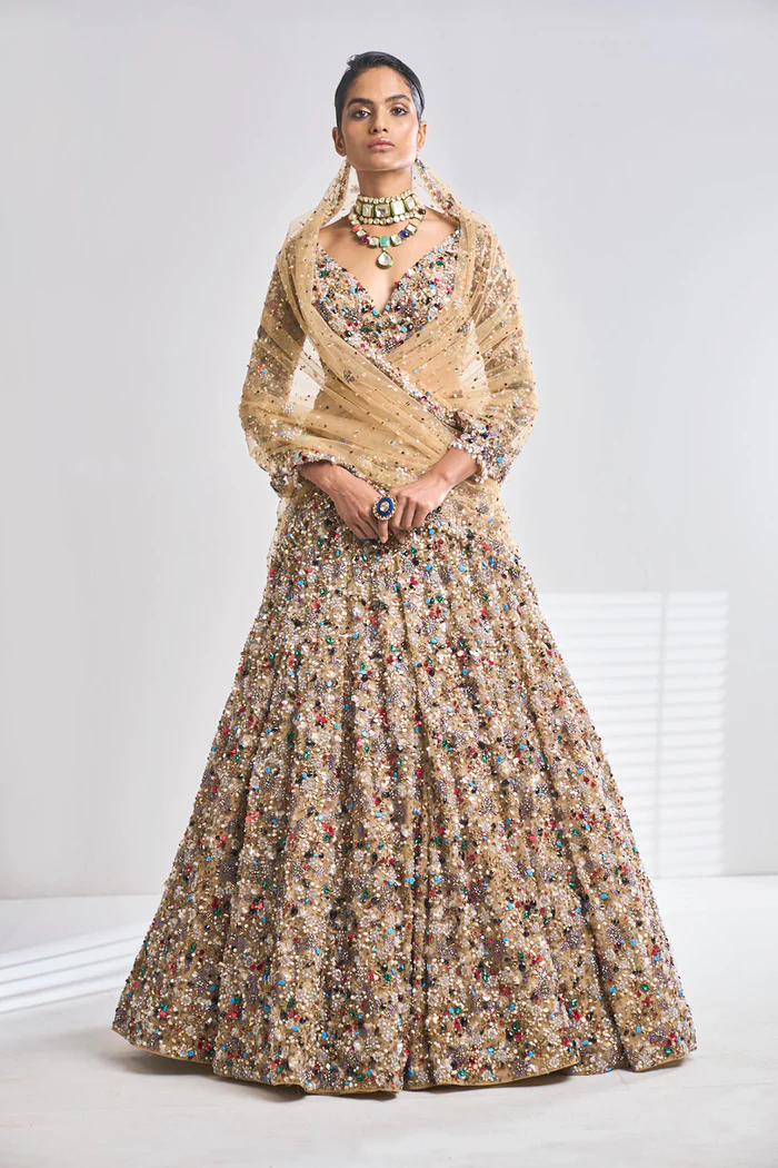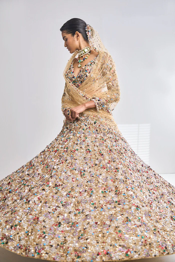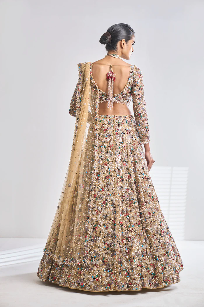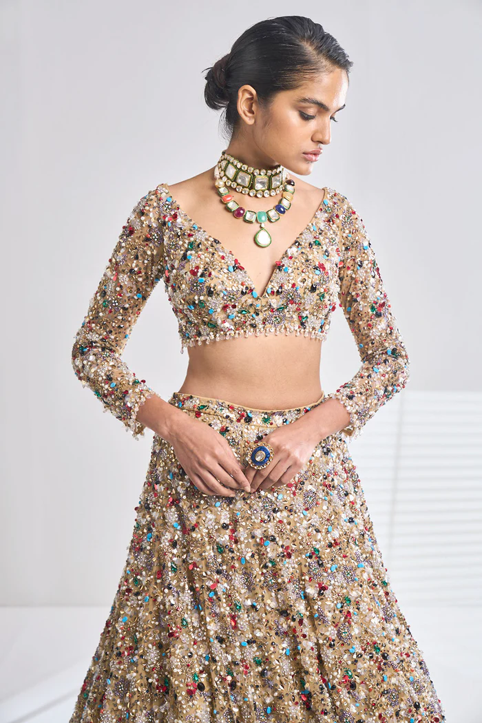 The choli is designed as a contemporary, structured bustier with a sophisticated plunging V-neckline and sheer long sleeves. It is crafted from a rich gold base, entirely encrusted with a dense mosaic of shimmering multi-colored sequins, beads, and micro-crystals that create a high-shine, multidimensional effect. The intricate hand-embroidery mirrors the floral themes of the ensemble, while a soft inner lining and built-in structure ensure a seamless, sculpted fit and exceptional comfort.