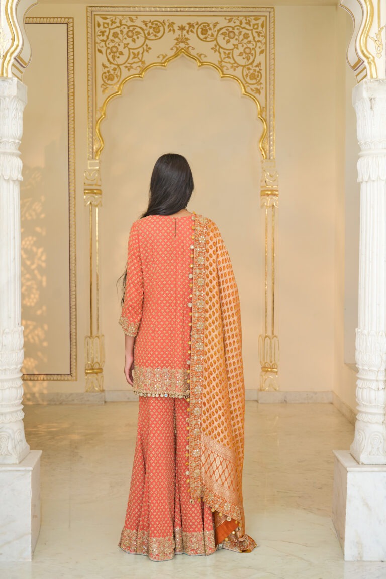 The short kurta is crafted in a soft coral shade with light gold accents, designed to bring out elegance and festive charm. It features intricate hand embroidery using mirror and cutdana work, creating a delicate and sophisticated texture throughout the garment.