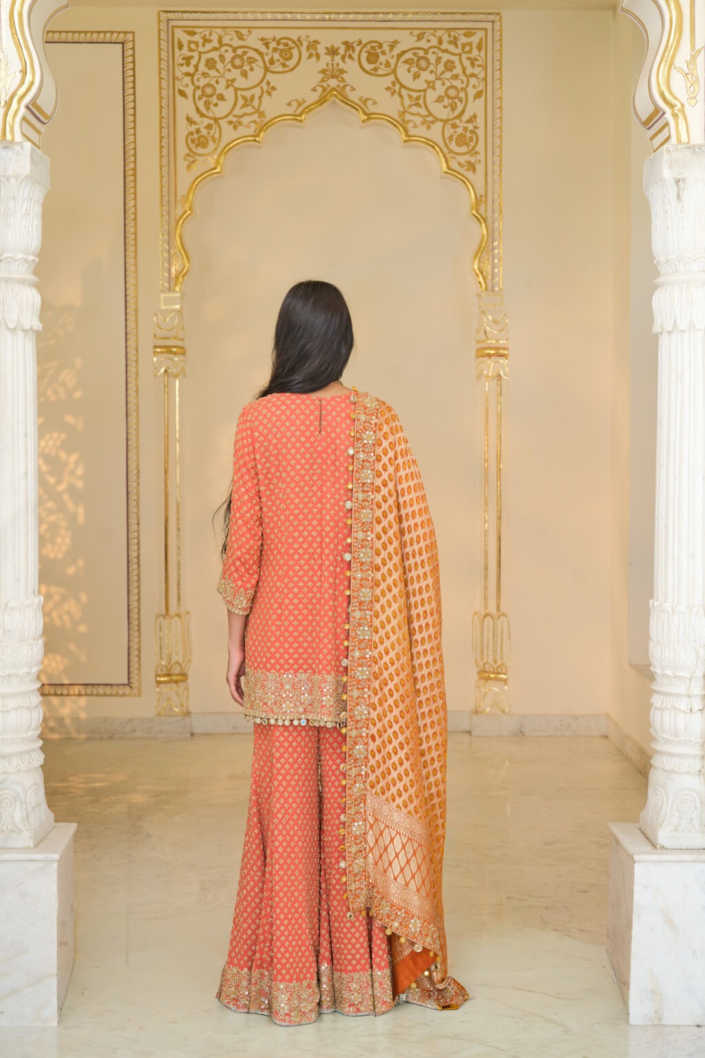 Paired with the kurta, the sharara is tailored for a flowing silhouette that adds volume and grace. Its structure supports the kurta while maintaining comfort, giving the outfit a traditional yet contemporary bridal appeal.