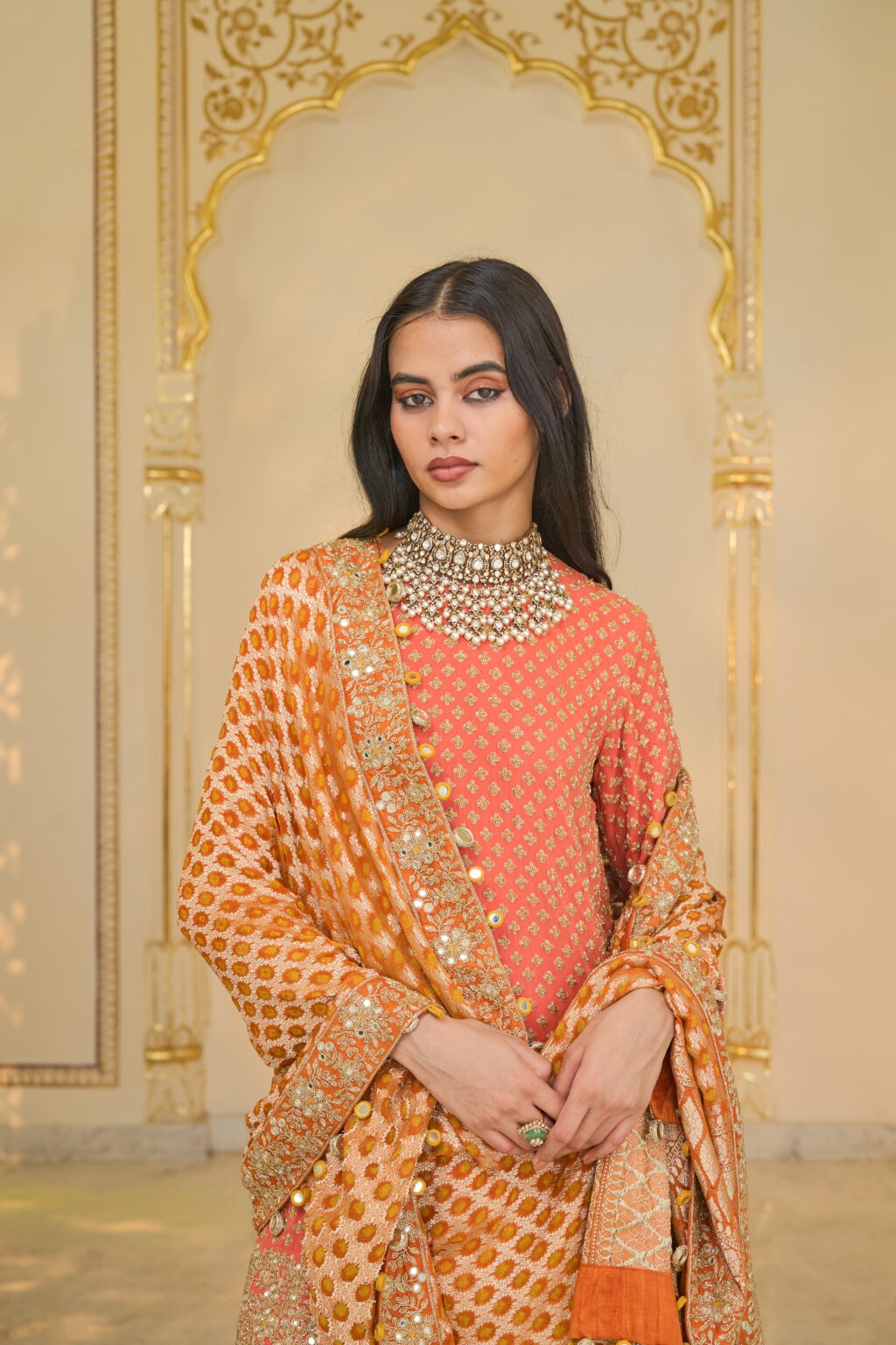 The ensemble is completed with a handmade orange bandhani dupatta featuring hand-embroidered borders and playful tassel detailing. Each piece is unique due to the handcrafted nature of the bandhani, ensuring a one-of-a-kind finish.