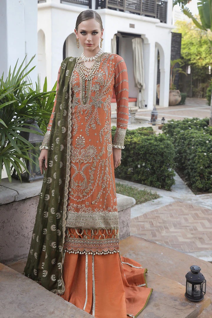 The kameez is designed in a bright orange shade with a stylish neckline and crafted from premium fabric for structure and comfort. Hand-applied detailing, including silverwork, pearls, sequins, and motifs, adds depth and elegance, creating a striking and glamorous appearance ideal for wedding celebrations.