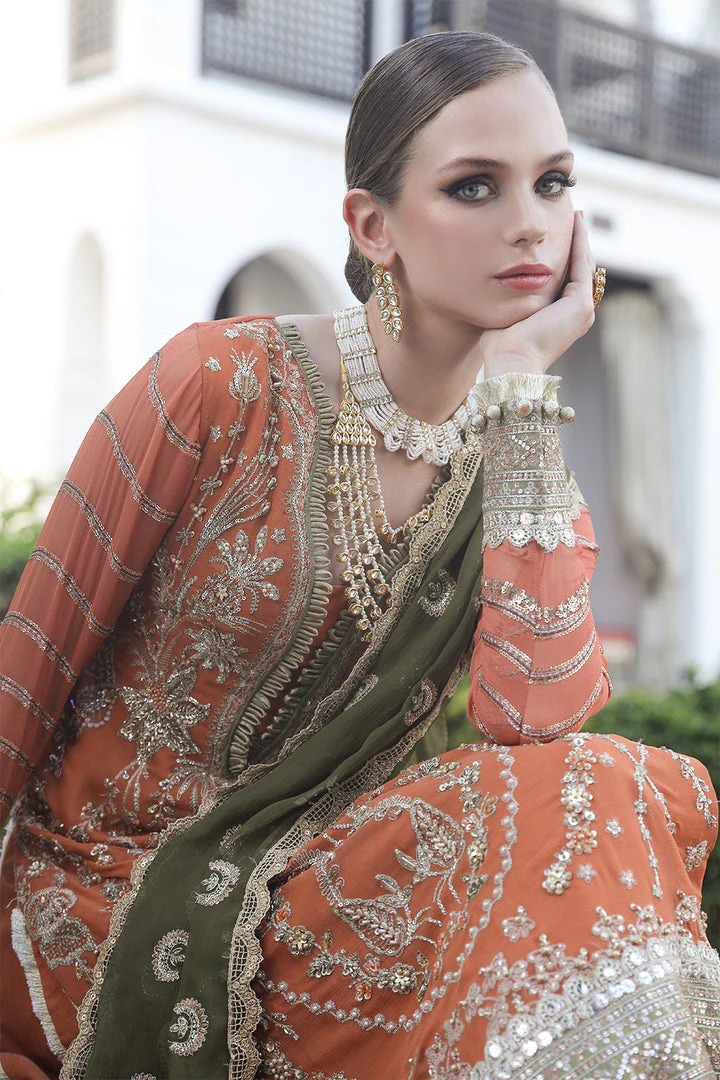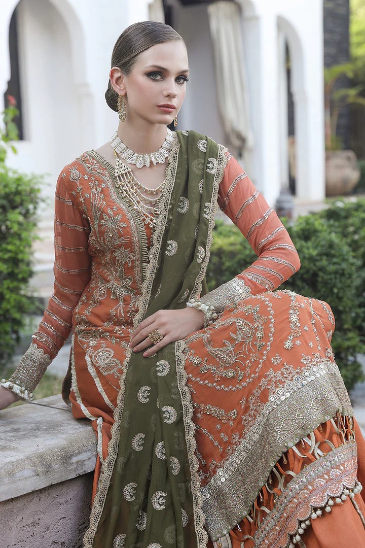 A vibrant orange kameez paired with a flared sharara and contrasting Mehndi-colored dupatta, exquisitely embellished for a stylish and traditional wedding look.
