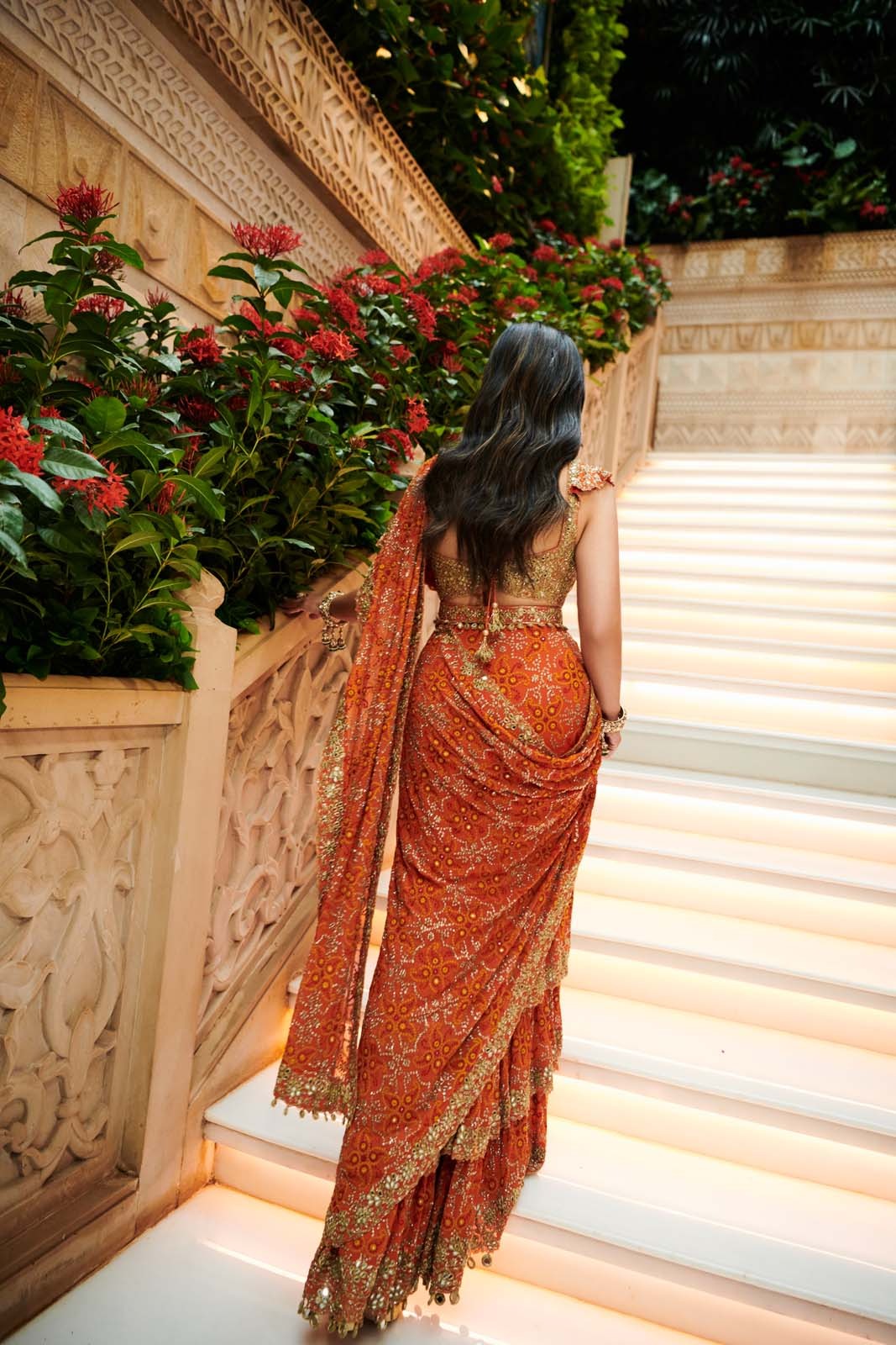 The sari’s tiered drape is designed to flow elegantly, offering a graceful silhouette while highlighting the detailed embroidery. The layers add volume and movement, enhancing the overall ensemble’s charm.