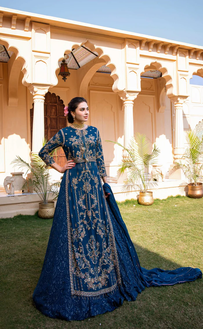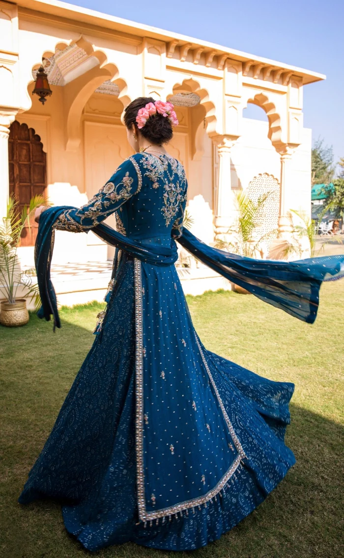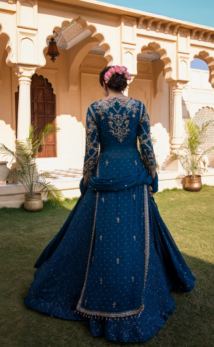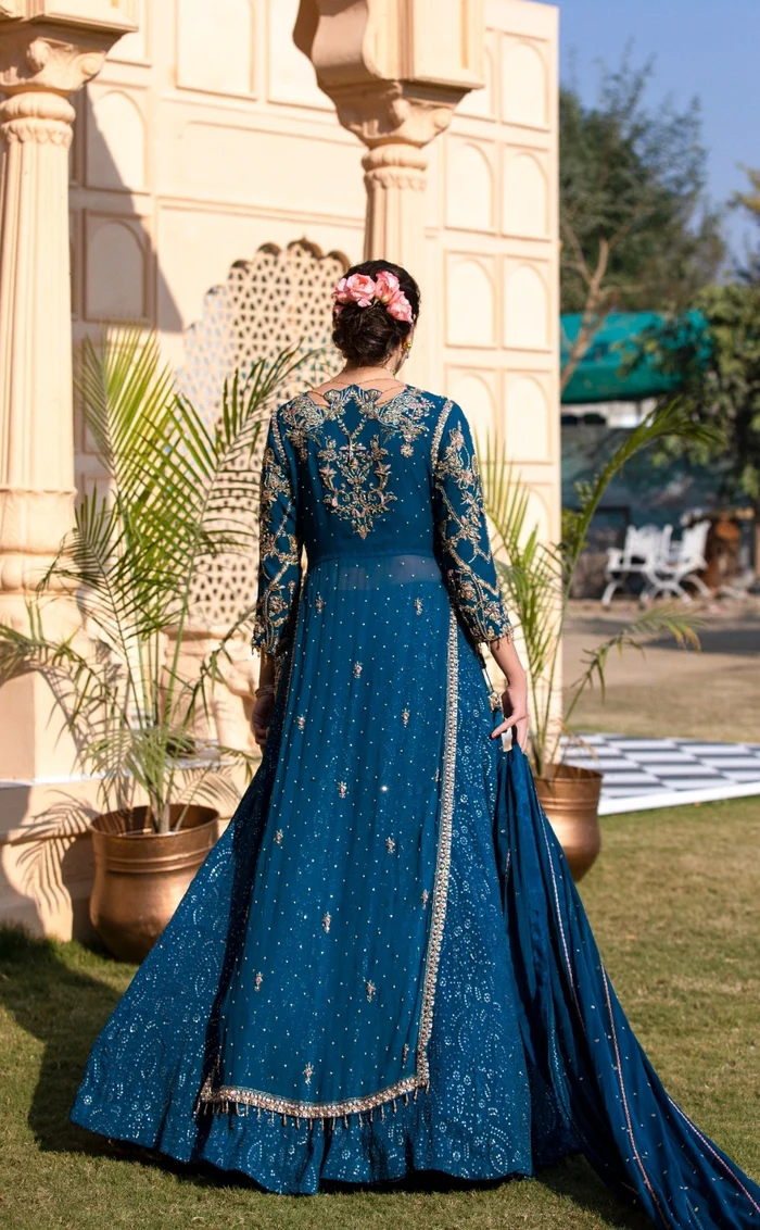 An elegant teal blue chiffon long shirt set featuring hand-embroidered sequins, crystals, and pearls, paired with a matching skirt and delicately embellished dupatta—perfect for weddings, engagements, and formal occasions.