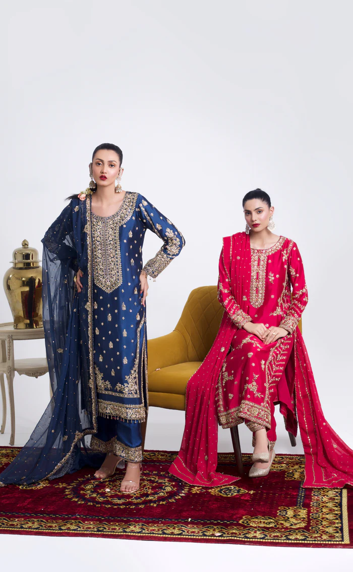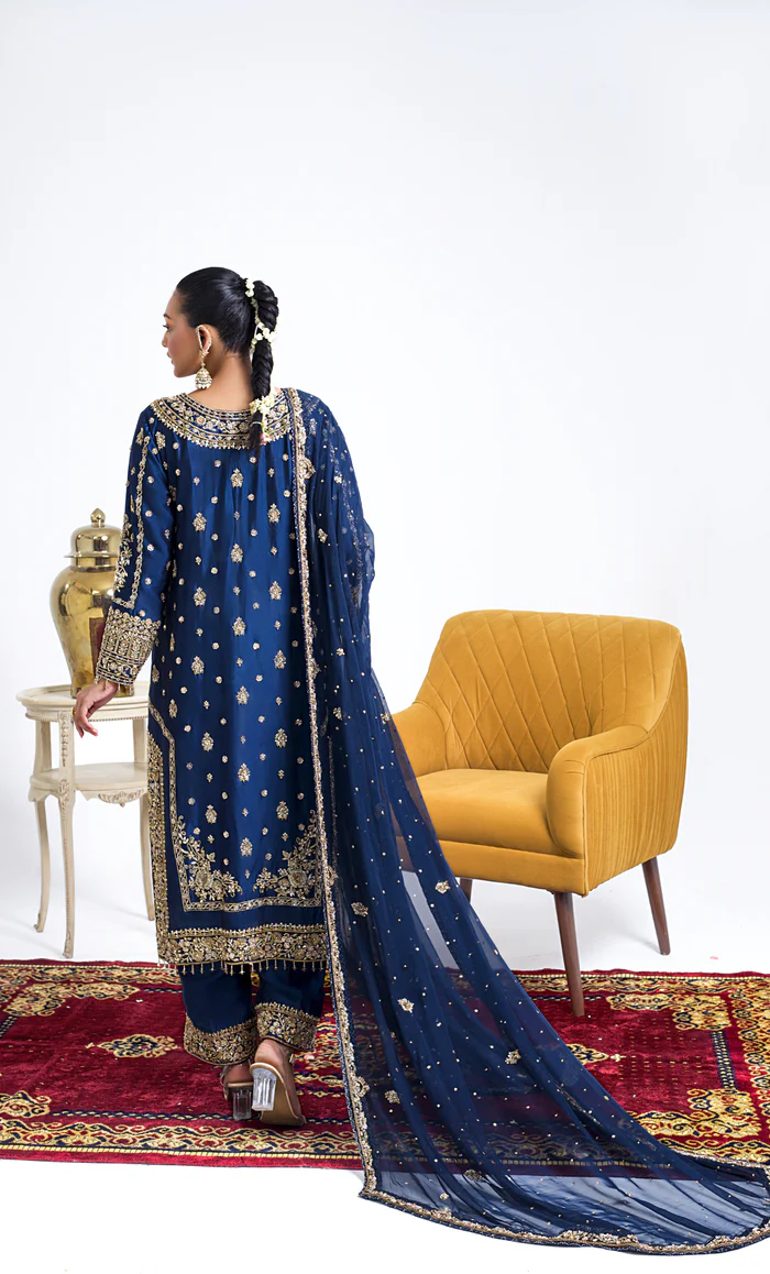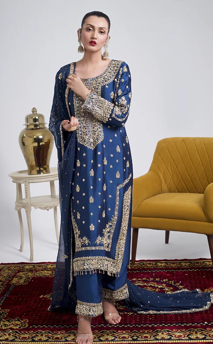 A refined teal blue outfit crafted from luxurious sheesha silk, adorned with intricate hand embroidery and paired with a soft chiffon dupatta for a graceful, timeless look.