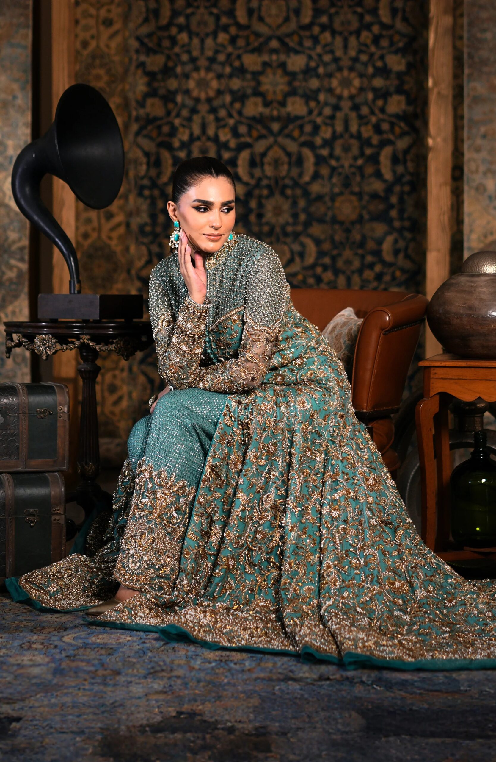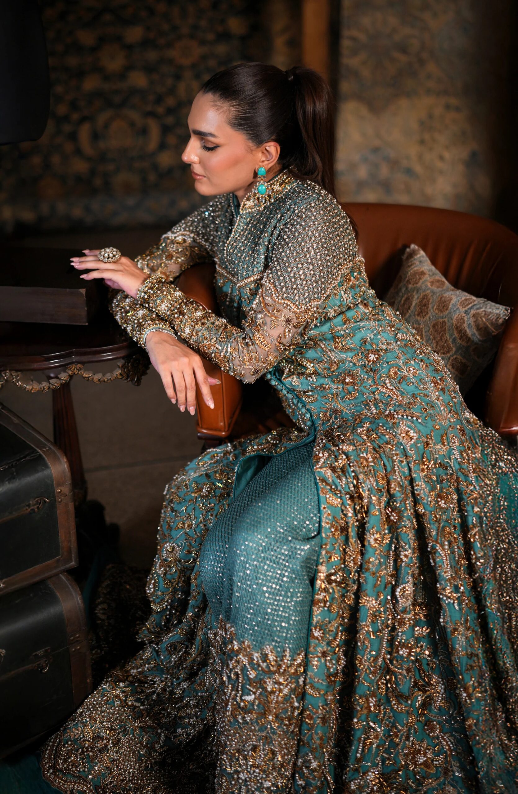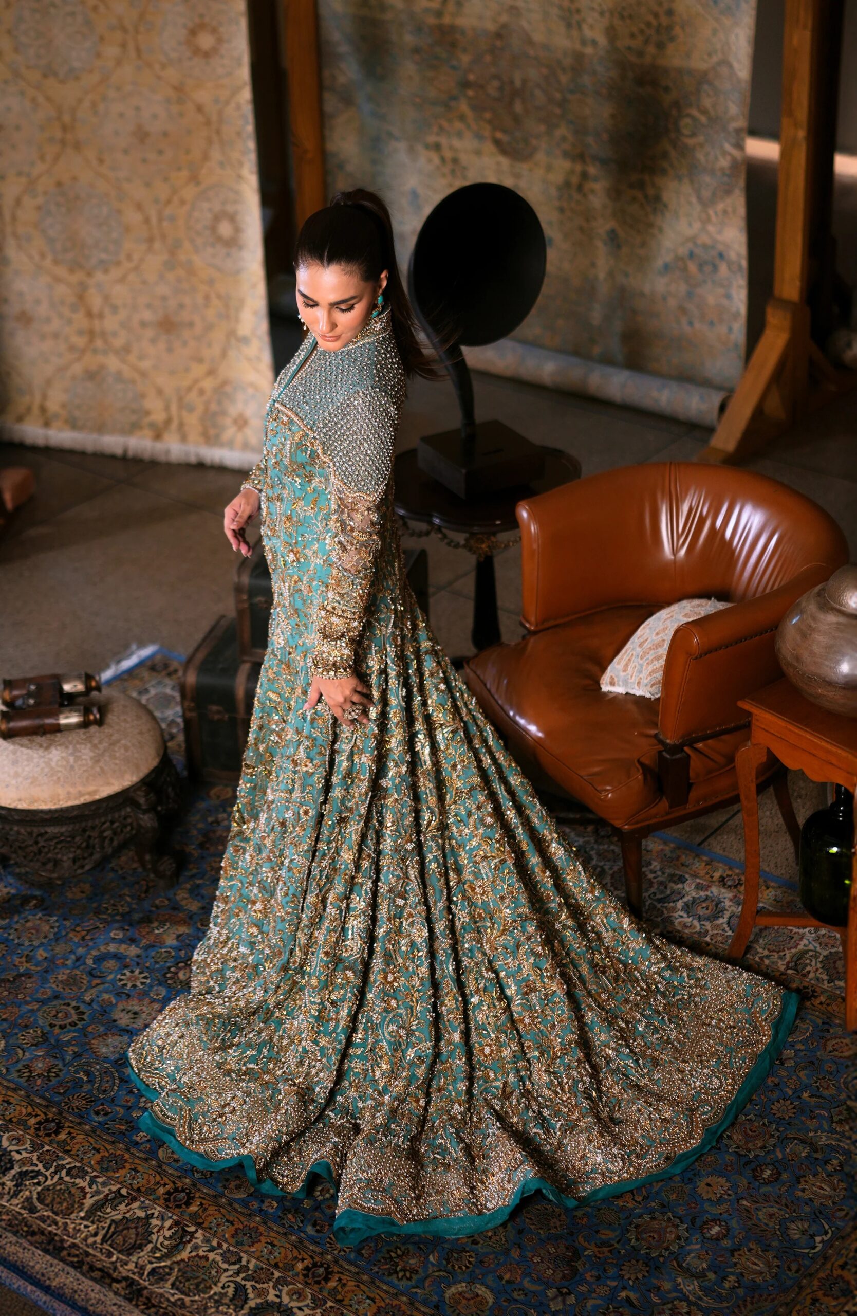 A front-open Tiffany blue gown adorned with intricate handwork, structured embellishment, and a graceful trailing silhouette designed for timeless elegance.