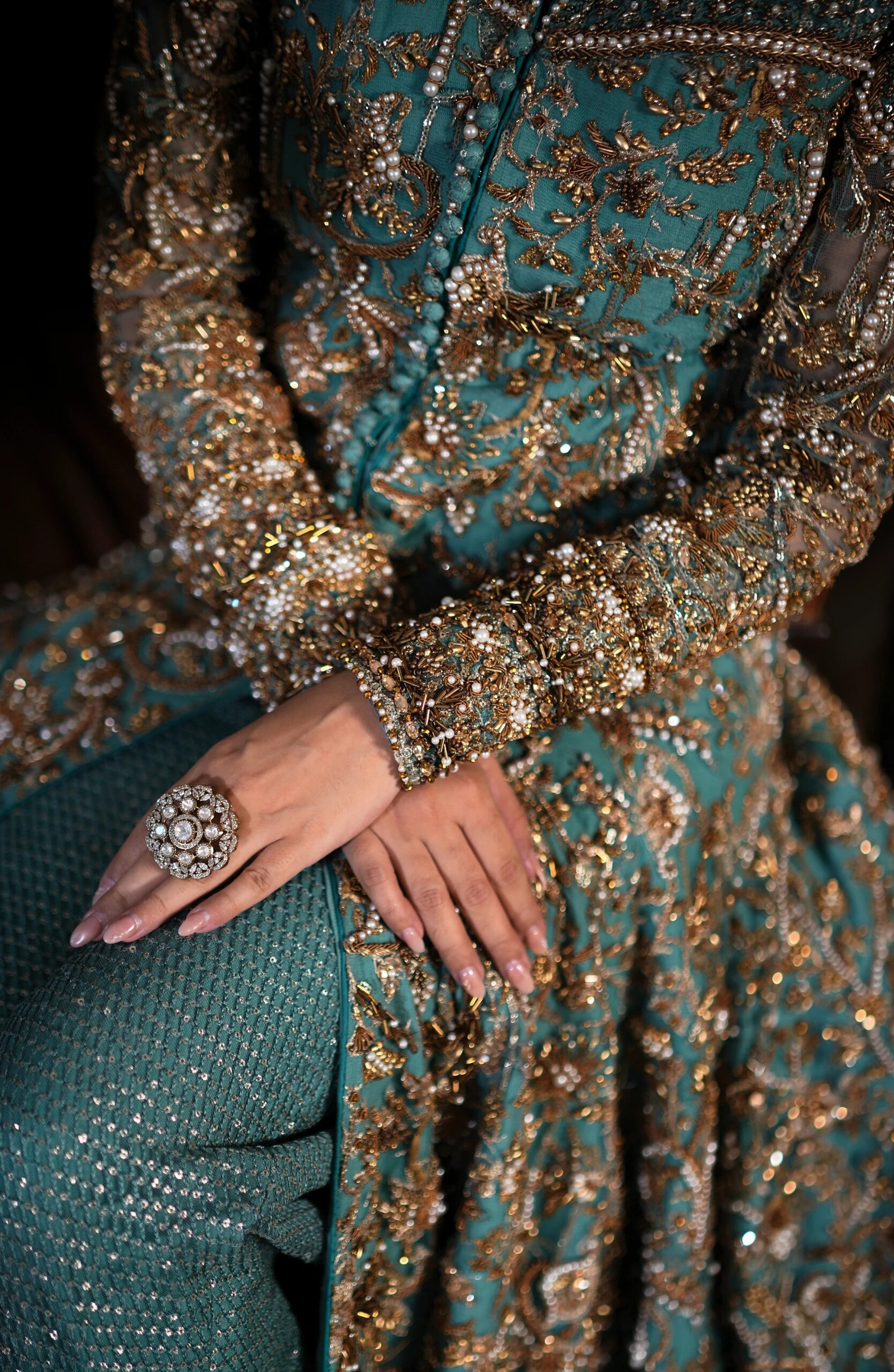 This long front-open gown is styled in a serene Tiffany blue shade, offering a refined and ethereal presence. Crafted from premium fabric, the silhouette features meticulously arranged embellishment that blends geometric precision with soft floral artistry. The hand-applied detailing enhances depth and structure, giving the gown a luxurious finish suitable for formal and bridal occasions.
