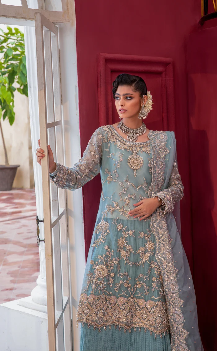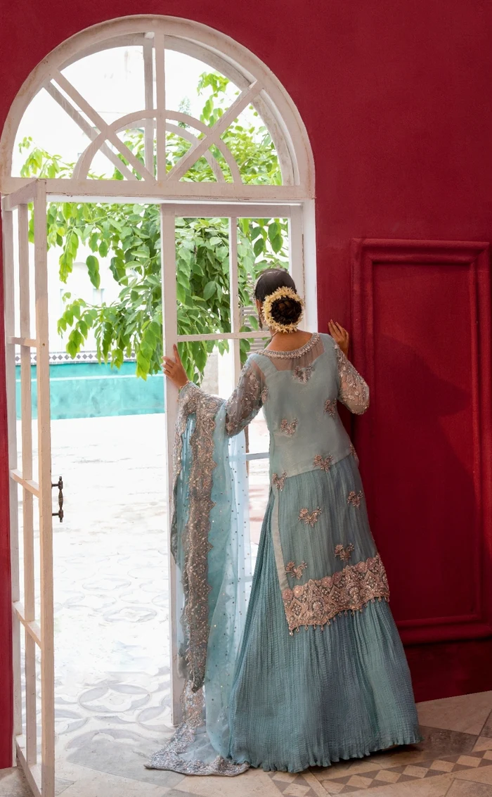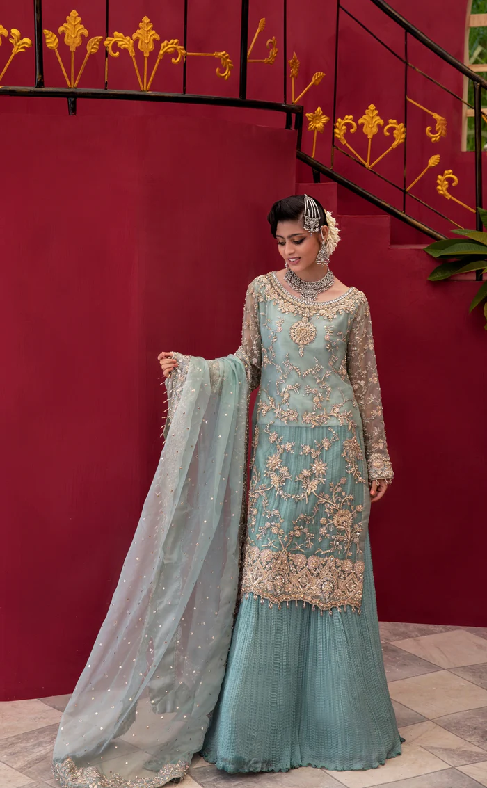 A breathtaking ensemble featuring a delicate organza shirt with shimmering tropical motifs, paired with a flowy Lawrence cotton gharara and a nude pink organza dupatta adorned with intricate hand embroidery.