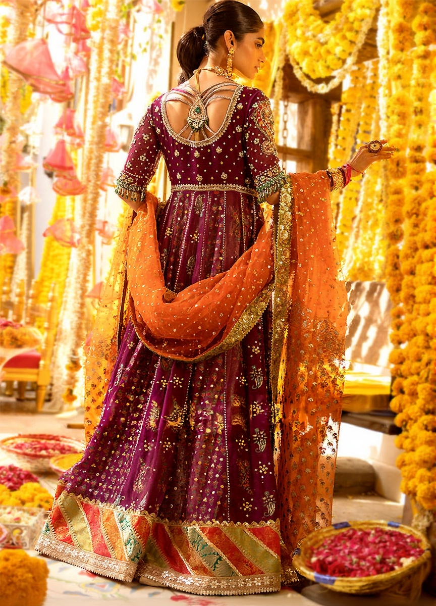 Intricate thread embroidery, sequins, and floral motifs applied carefully to enhance the richness and festive appeal of the ensemble.
