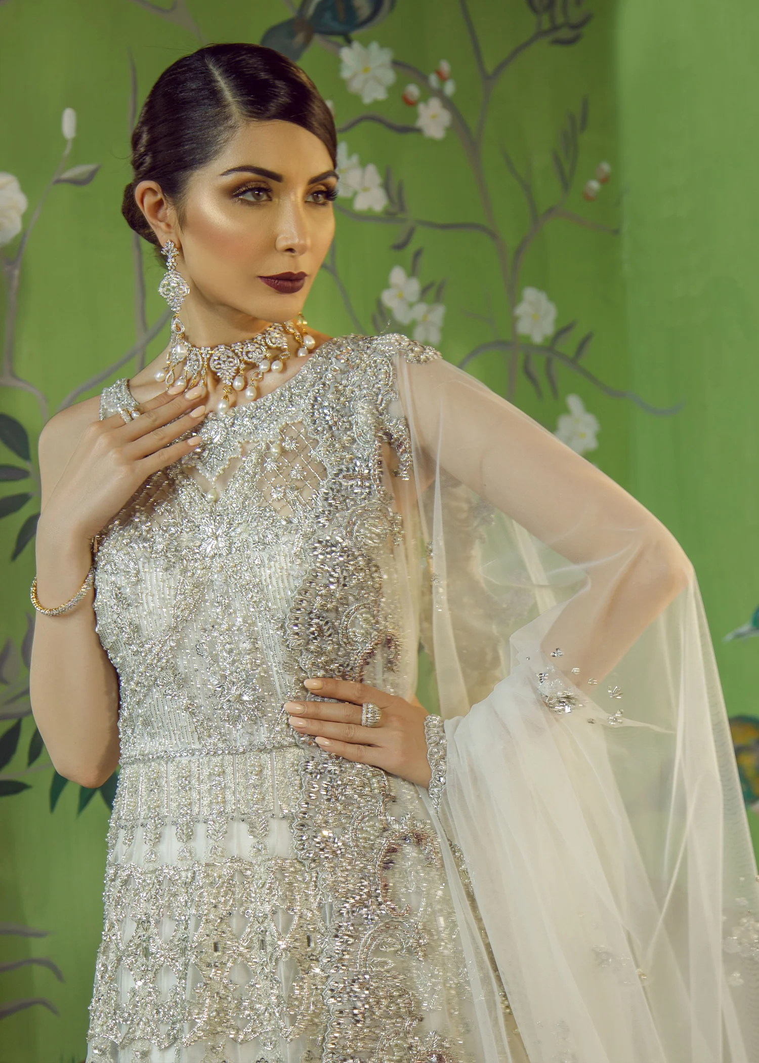 Crystal accents and silver metal work featuring finely crafted nakshi and dabka techniques, complemented by lace inspired motif detailing on the dupatta border.