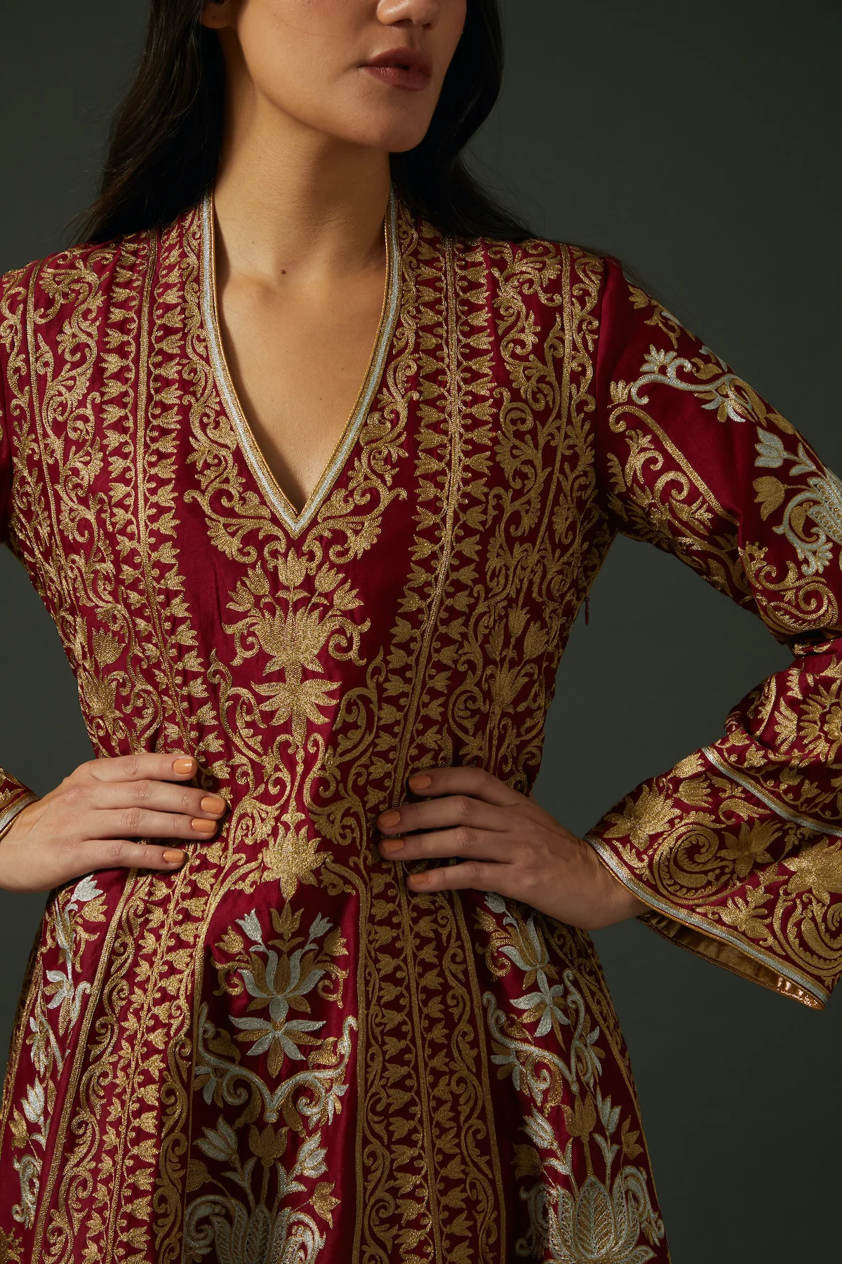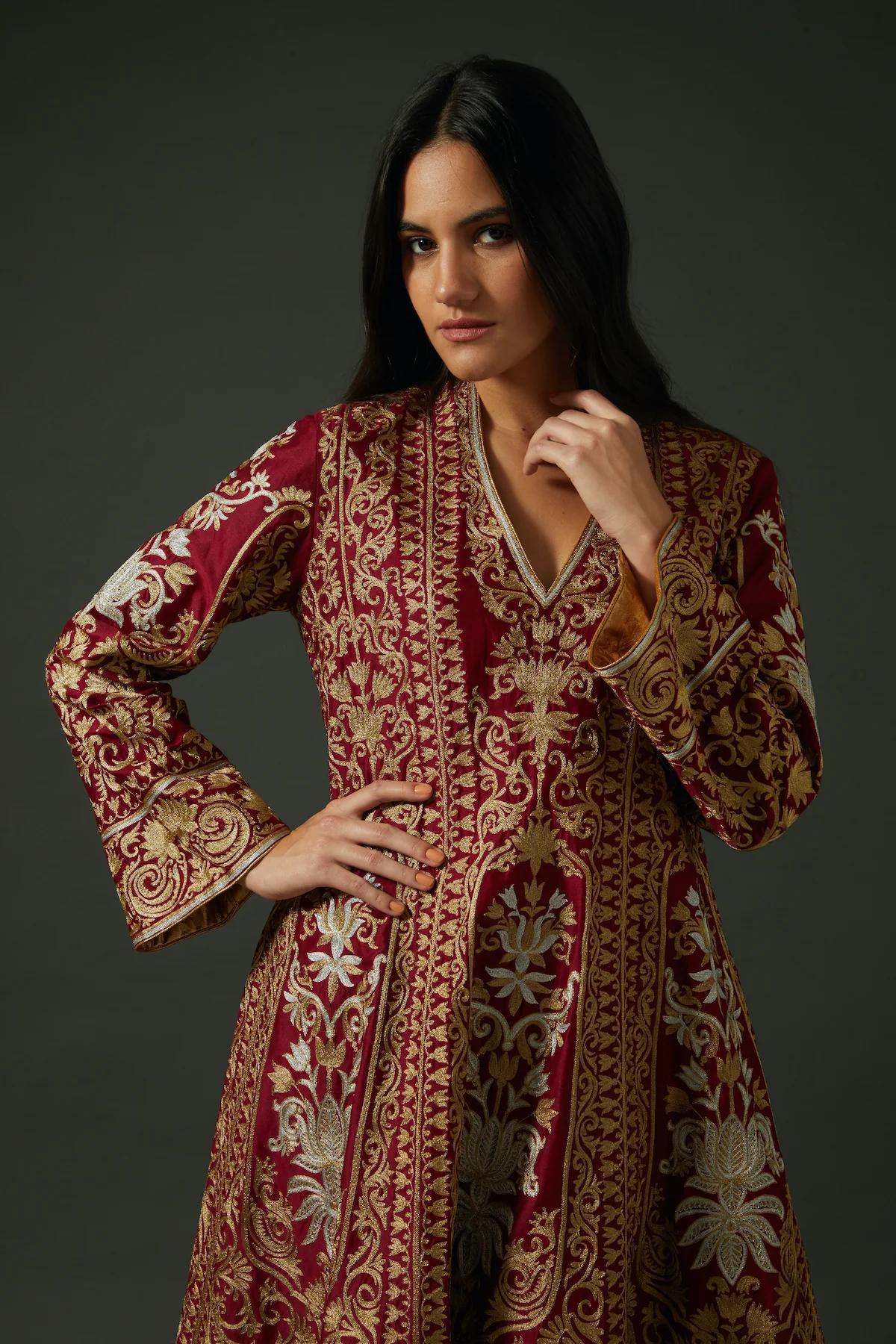 Refined embroidery featuring thread motifs and subtle detailing to enhance the ensemble’s understated elegance.