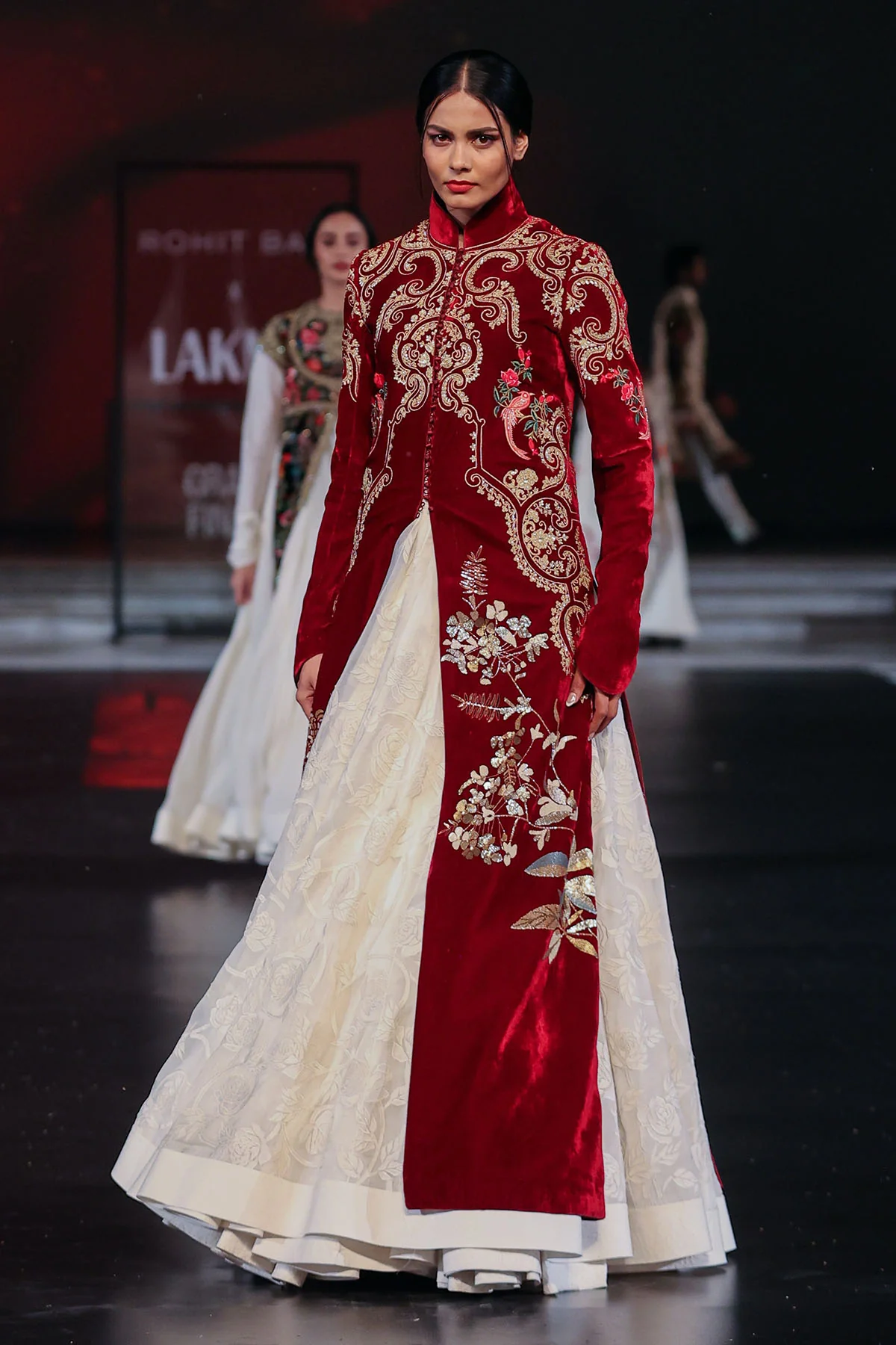 The jacket is crafted from rich velvet in a deep wine shade, designed with a sophisticated mandarin collar that adds a structured, regal touch. Intricate embroidery enhances the front panels, neckline, and sleeves, creating a balanced and elegant visual appeal. The fabric’s natural sheen elevates the detailing, while a smooth inner lining provides comfort and ensures a graceful fall. Neatly finished edges and precise tailoring complete the polished look.