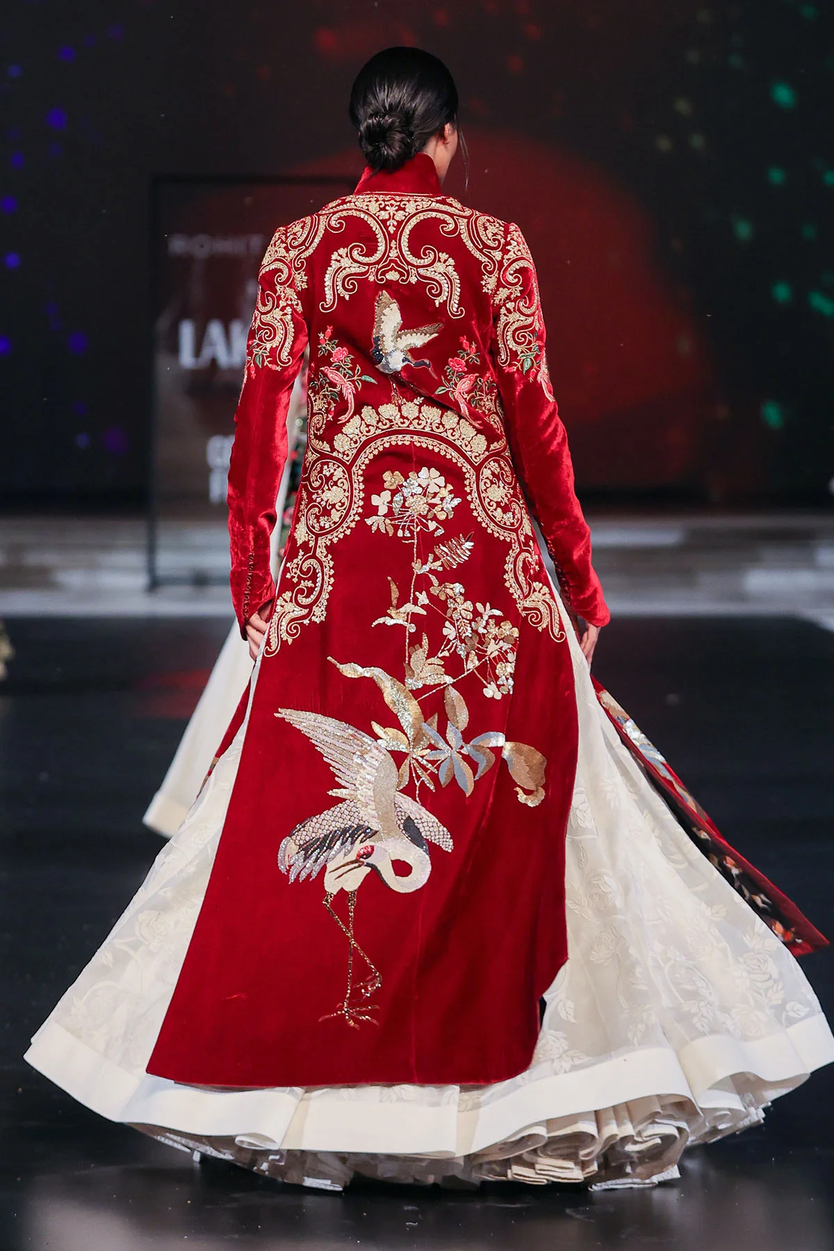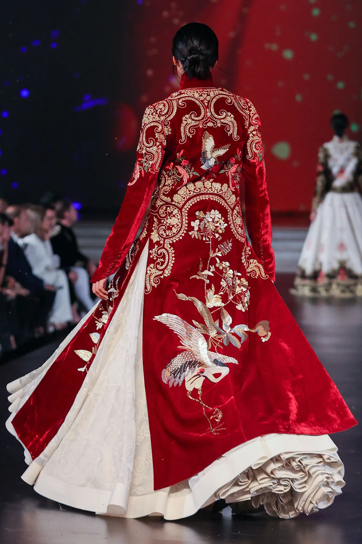 A luxurious wine velvet long jacket featuring elegant embroidery and a refined mandarin collar, crafted to elevate both traditional and contemporary ensembles.