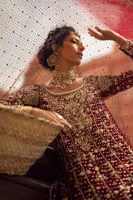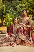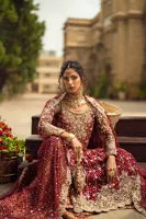 Zar-e-Aroos is a classic red bridal lehenga crafted on a luxurious silk base, designed to embody traditional grandeur with a refined contemporary finish. The voluminous lehenga flows gracefully, creating an unmistakably regal bridal presence.