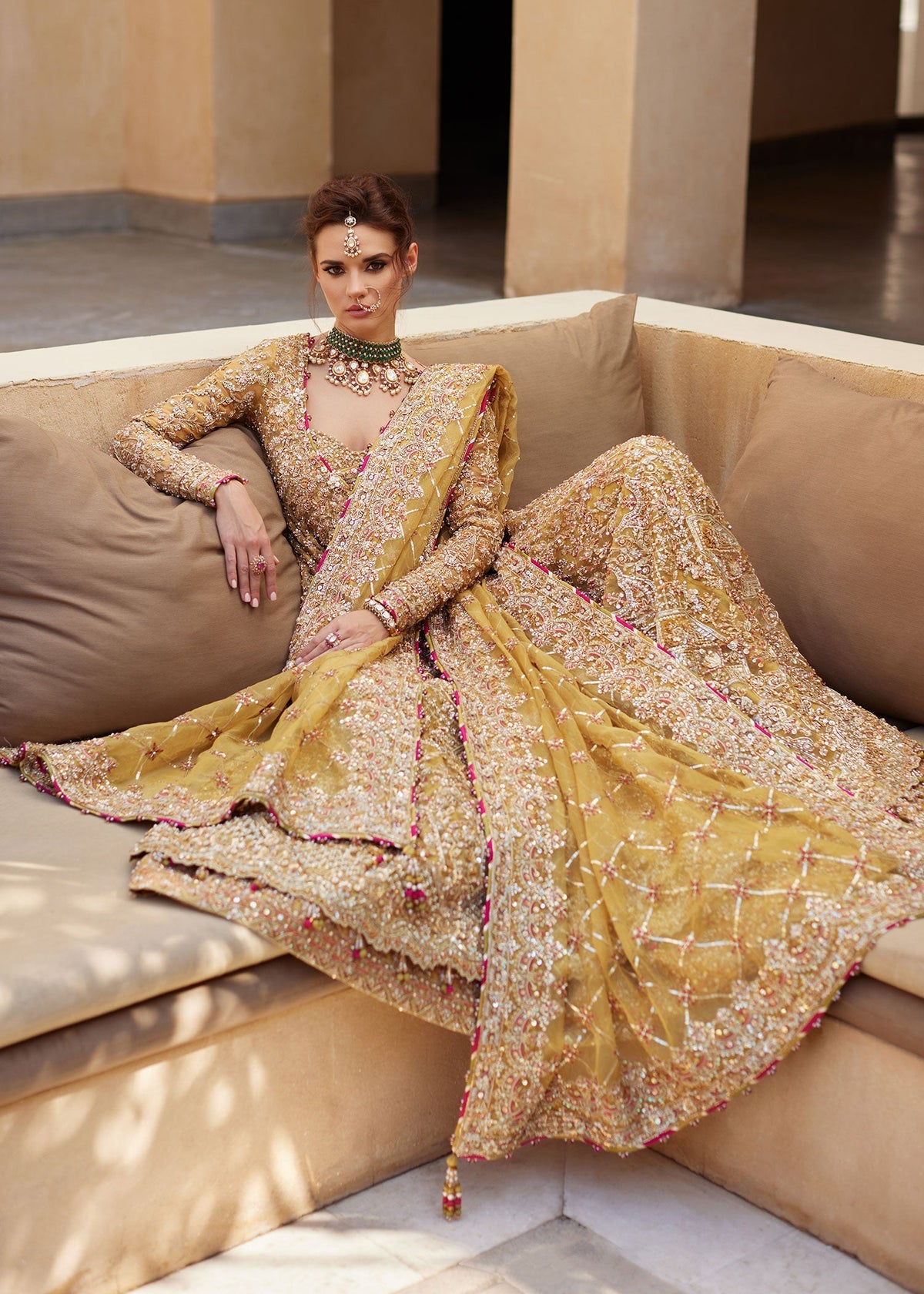 An elegant yellow anghrakha-style gown paired with a richly embellished lehenga and an airy organza dupatta, designed to reflect timeless bridal grace with a refined modern touch.
