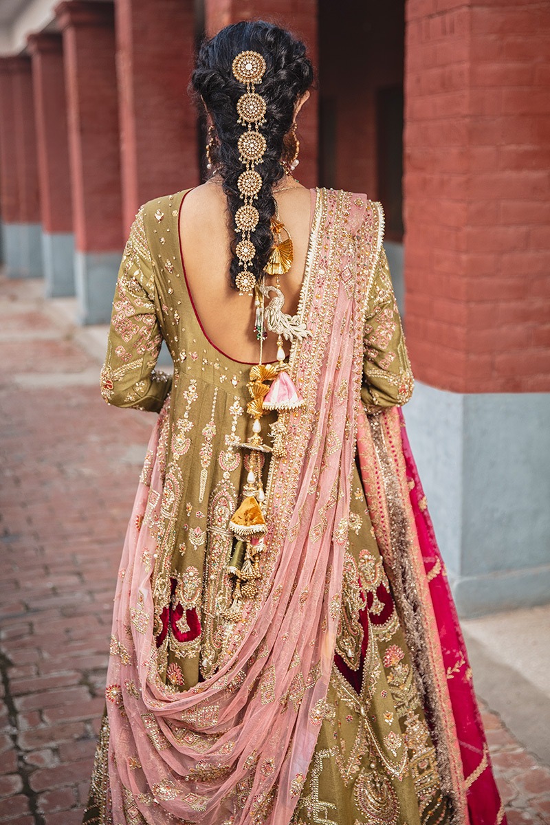 The peshwas is crafted from pure silk in a serene moss green shade. Designed with a classic flowing silhouette, it reflects timeless bridal elegance while allowing the richness of the fabric and hand detailing to take center stage.
